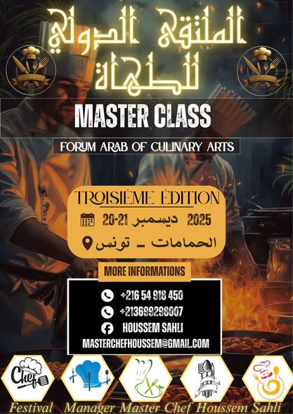 ينتظم بمدينة الحمامات الملتقى الدولي للطهاة بتونس في نسخته الثالثة والذي ستدور فعالياته أيام /20/21 ديسمبر 2025 .