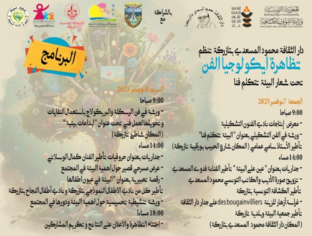 تحت إشراف المندوبية الجهوية للشؤون الثقافية بنابل، تحتضن دار الثقافة محمود المسعدي بتازركة يومي 07 و08 نوفمبر 2025 تظاهرة “ايكولوجيا الفن” تحت شعار “البيئـــة تتكــــــــلّم فنّـــــــــا “